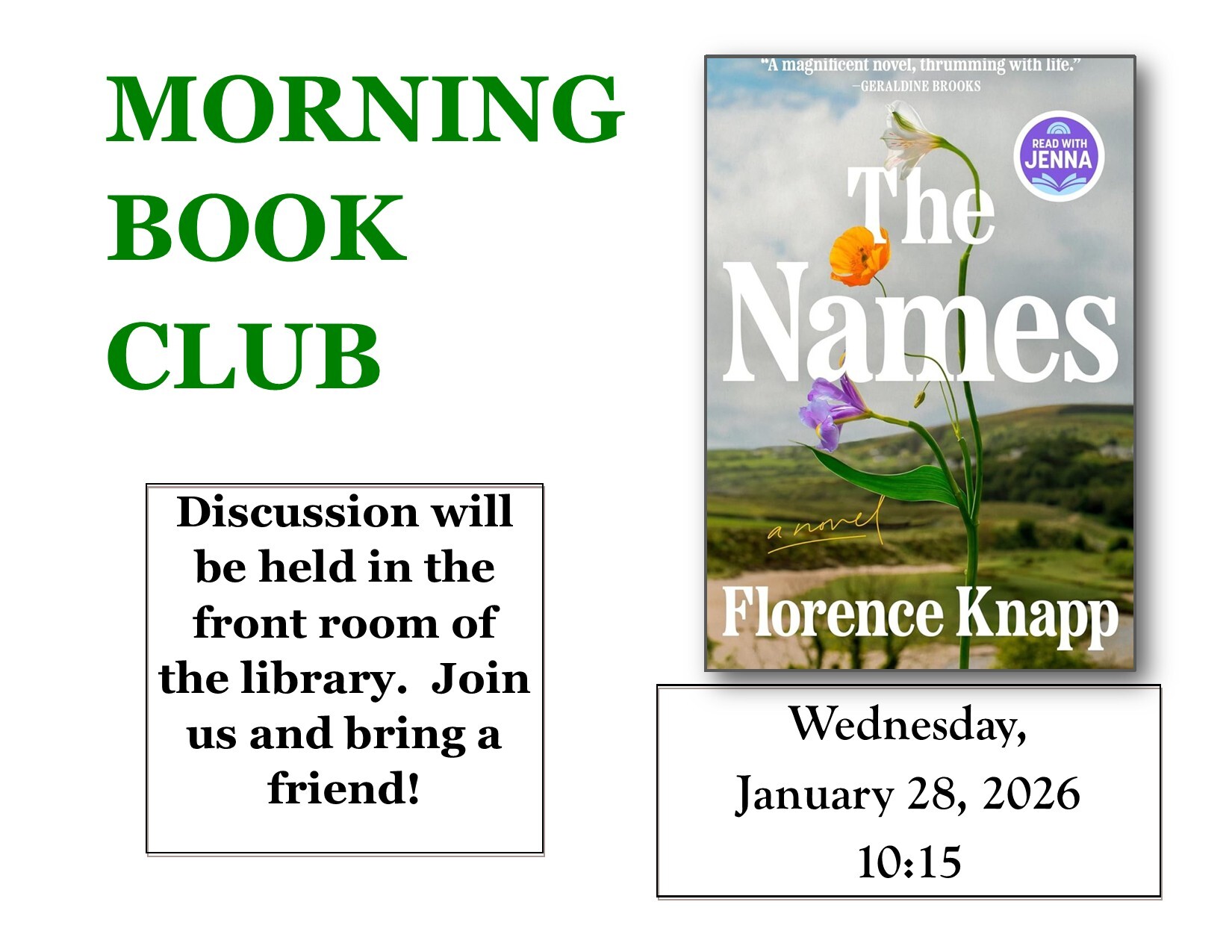 Our monthly Morning Book Club series takes place in the library’s downstairs meeting room and features lively, in-depth discussion of a new title each month. Attendees are encouraged to bring a friend and participate in conversation about the book’s central characters, plot, setting, theme, and more.