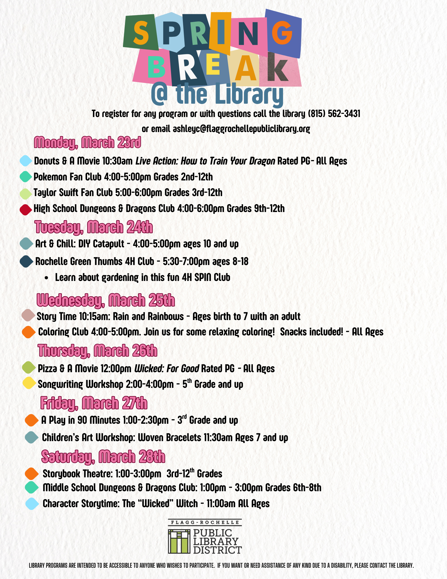 Join us for an art project, snacks and relaxation at the library on the 2nd and 4th Tuesday of the month from 4:00 to 5:00 PM.