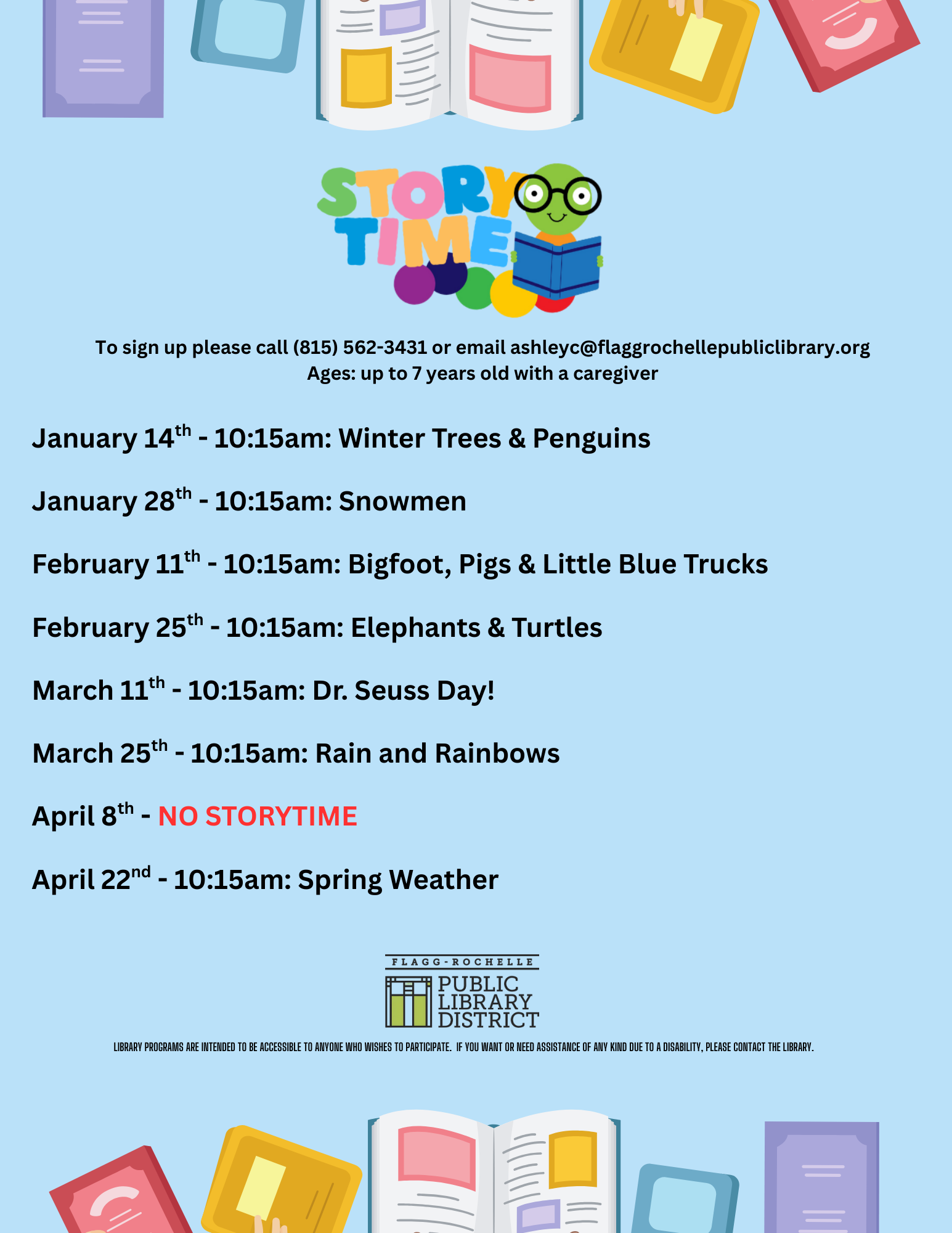 Story Time is for children up to 7 years old with a parent or caregiver. Each Story Time is themed and includes opportunities for attendees to interact with the book or story.